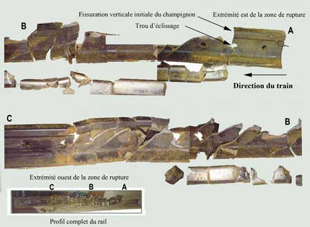 Le champignon s'est rompu sur l'axe longitudinal, témoignant d'une fissuration verticale du champignon à partir du dessus de la surface de roulement. Comme la rupture était récente, elle n'a pas été décelée au moyen de l'essai de détection des défauts de rails par ultrasons effectué sept mois avant le déraillement.