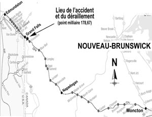 Le 6 octobre 2001, vers 15 h 30, heure avancée de l'AtlantiqueNote de bas de page 1, le train de marchandises no M-306-31-05 (le train 306) du Canadien National (CN)Note de bas de page 2 part d'Edmundston (Nouveau-Brunswick) à destination de Moncton (Nouveau-Brunswick) (Figure 1). Le train compte 3 locomotives, 60 wagons chargés, 52 wagons vides et 18 wagons de résidus. Il mesure environ 8 700 pieds et pèse quelque 10 000 tonnes. L' équipe du train comprend un mécanicien et un chef de train. Ils répondent tous deux aux exigences en matière de condition physique et de repos. Ils sont qualifiés pour occuper leurs postes respectifs et ils connaissent bien la subdivision.