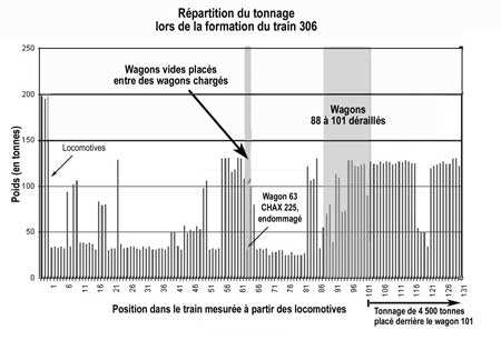 La figure 2 illustre la répartition du tonnage au moment de la formation du train 306. Le graphique indique le poids de chaque wagon, exprimé en tonnes, en regard de la position du wagon dans le train. Le diagramme montre que la plus grande partie du poids du train était concentrée à l'arrière - 4 500 tonnes se trouvaient derrière le 101e wagon - et que la plupart des wagons déraillés avaient été placés tout juste devant ce tonnage placé à la queue du train. De plus, la figure met en évidence le 63e wagon, no CHAX 225, en l'occurrence un wagon vide qui a été gauchi et a déraillé. Le CHAX pesait moins du tiers (1/3) du poids de chacun des wagons entre lesquels il avait été placé.