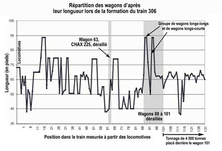 La figure 3 illustre la répartition des wagons d'après leur longueur au moment de la formation du train 306. La figure montre la longueur de chaque wagon, exprimée en pieds, en regard de la position du wagon dans le train. Le diagramme montre que les wagons déraillés avaient été placés suivant des combinaisons wagons longs/wagons longs et wagons longs/wagons courts, qui font en sorte que la structure de la voie subit des contraintes latérales accrues lorsque des efforts de compression s'exercent dans une courbe.