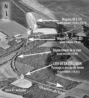 Les wagons 88 à 101 ont déraillé dans le raccordement parabolique situé au début d'une courbe vers la droite entre le point milliaire 179,75 et le point milliaire 179,52. Le 88e wagon est resté sur ses roues. Les wagons 89 à 92 se sont couchés du côté sud de la voie ferrée. Les 93e et 94e wagons, deux wagons longs (servant au transport d'automobiles) munis d'amortisseurs hydrauliques en bout de wagon, se sont mis en portefeuille, et six wagons-citernes sous pression, chargés de gaz de pétrole liquéfiés, se sont tamponnés derrière eux. Le bouclier protecteur et la longrine tronquée des wagons-citernes déraillés ont été endommagés.