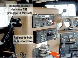 Les chemins de fer appliquent des méthodes visant à limiter les forces qui s'exercent sur le train pendant un serrage d'urgence des freins. Le CN, pour sa part, a émis dans l'indicateur no 78 une directive voulant qu'on serre le frein d'urgence à partir de la locomotive et de la queue du train. Pour ce faire, on place le robinet de mécanicien à la position de serrage d'urgence et on actionne l'interrupteur à bascule de freinage d'urgence sur le pupitre de commande de la locomotive (Photo 4). De plus, au moment de l'accident, le CN faisait des tests avec un système de contrôle de queue qui déclenche automatiquement un freinage synchronisé à partir de la locomotive et de la queue du train dès que l'on commande un freinage d'urgence ou un freinage gradué. Certaines compagnies de chemin de fer des États-Unis ont déjà équipé leurs trains de tels systèmesNote de bas de page 11. Depuis le 1er novembre 2001, l'AAR exige que toutes les locomotives neuves soient munies de dispositifs de contrôle de queue automatisésNote de bas de page 12 afin qu'elles soient conformes à l'article 232.405 du titre 49 du Code of Federal Regulations (49 CFR 232.405) des États-Unis de la Federal Railway Association (FRA) intitulé Design and Performance Standards for Two-Way End-of-Train DevicesNote de bas de page 13. Le règlement de la FRA exige que toutes les locomotives commandées le 1er août 2001 ou après cette date, ou mises en service pour la première fois le 1er août 2003 ou après cette date, soient conçues de façon à déclencher automatiquement un freinage d'urgence simultané à la tête et à la queue du train dès que le mécanicien commande un serrage d'urgence des freins à air du train.