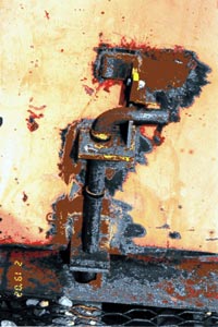 Les ferrures de la paroi et la goupille de verrouillage avaient disparu et les soudures des ferrures étaient couvertes de rouille. Il a été établi que, depuis une période indéterminée, on avait utilisé un bout de tuyau auquel une petite valve était fixée et qu'on l'avait inséré dans le plancher du wagon, devant la paroi de bout, afin de fixer la paroi en place. Ce dispositif de fortune n'a pas été retrouvé. La butée de paroi, soudée au côté du wagon n0 CN 46570 pour empêcher la paroi de se balancer, avait disparu, et la soudure était couverte de rouille.