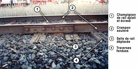- Écartement – surécartement, irrégularités, marques de boudins, soulèvement ou inclinaison des crampons, traverses détériorées par les selles