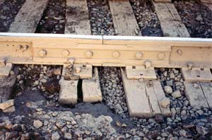 Il y avait plusieurs joints sur les deux rails, immédiatement au nord du passage à niveau. Sur le rail ouest, un joint avait une cale d'épaisseur. Un coupon de rail de 18 pieds était boulonné sur le rail est, et les deux joints étaient écrasés. Un joint reposait sur deux traverses mais n'était assujetti que par une selle de rail (voir la photo 2), étant donné que l'autre selle avait fini par se séparer de la traverse. Un jeu d'éclisses avait aussi été installé sur le rail est, à un endroit où le champignon était aplati et écrasé. Ces éclisses étaient retenues en place par quatre boulons vissés dans les trous placés aux extrémités. On a relevé des signes de remontées de boue et de mauvais écoulement des eaux, surtout près des joints situés au nord du passage à niveau (voir la photo 3). L'examen de plusieurs autres franchissements routiers dans un rayon de 10 milles des lieux du déraillement a révélé des conditions similaires.
