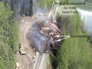 Le chef de train et l'employé d'entretien de la voie ne peuvent pas accéder au pont en passant par la route,mais ils peuvent s'en approcher jusqu'à environ 1 km. Inquiet d'une exposition possible aux vapeurs toxiques de marchandises dangereuses, et ayant conclu que la situation est sûrement très grave, le chef de train ordonne à l'employé d'entretien de la voie d'aller alerter les services d'urgence. Le chef de train continue ensuite vers l'ouest, en direction de l'extrémité est du pont. Il constate que les locomotives et un certain nombre de wagons sont tombés dans le ravin et ont pris feu. Il est incapable de localiser les membres de l'équipe. La chaleur de l'incendie est si intense qu'il est impossible de s'approcher des locomotives. On informe le CCF que deux locomotives et plusieurs wagons de bois d'oeuvre ont déraillé sur le pont du point milliaire 7,9, et sont enveloppés par les flammes au fond du ravin.