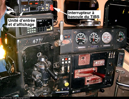 Le train était équipé d'un TIBS, qui se composait de trois éléments distincts : une unité logique de communications installée dans le capot court de la locomotive, une unité de détection et de freinage (UDF) montée dans l'attelage arrière du dernier wagon, et une unité d'entrée et d'affichage (UEA) placée dans la cabine de la locomotive. Un interrupteur à bascule était monté sur l'UEA, dont le mécanicien pouvait se servir pour commander un serrage d'urgence en queue (voir la photo 1). La section 7.3 (b) des IGE du CN exige que le conducteur commande un freinage d'urgence en queue chaque fois qu'un freinage d'urgence est ordonné.