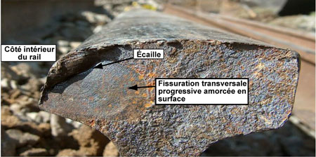 - Il a été impossible de savoir depuis combien de temps les défauts transversaux étaient présents, ni de déterminer la vitesse de croissance des défauts. Toutefois, la dernière auscultation par ultrasons, faite en mai 2005, n'avait signalé aucun défaut transversal. Il y a aussi lieu de signaler qu'il est difficile de détecter des fissures transversales comme des défauts transversaux quand le rail est aussi affecté par un écaillage, car l'écaillage pourrait empêcher les ultrasons de déceler les fissures transversales.