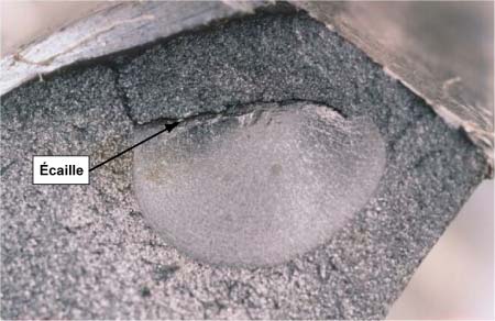 L'écaillage dans un rail est un défaut de fatigue qui est causé par les efforts exercés par le passage du matériel roulant. À mesure que le rail s'use du fait du tonnage qu'il supporte, la combinaison d'une géométrie non conforme du contact entre les roues et les rails - contact entre le boudin de roue et le champignon du rail - et du frottement de glissement occasionne des efforts qui causent un écoulement plastique de la surface du railNote de bas de page 24 (fluage) du côté intérieur du rail de la file haute et du côté extérieur du rail de la file basse. Ces efforts donnent lieu à des défauts dus à une fatigue de surface (écaillage et microfissures de surface) qui cachent d'autres défauts internes. L'écoulement plastique sur le rail de la file haute peut entraîner un écrasement du congé de roulement qui fait ressortir des écailles provenant de l'intérieur du rail ou des inclusions internes. Ces défauts sont à l'origine de défauts variés, notamment des défauts transversaux comme des fissures transversales. Une fois qu'elles se sont formées, les écailles peuvent se propager sur une certaine longueurNote de bas de page 25.