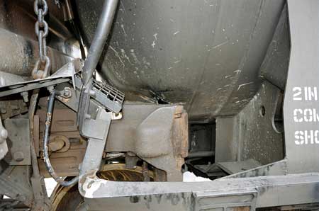 Les enquêteurs n'ont pas relevé de dommages antérieurs au déraillement sur le matériel roulant et n'ont pas relevé de dommages à la voie ferrée. Ils ont noté que le robinet d'arrêt situé au bout B du wagon couvert était fermé complètement (voir la photo 2).