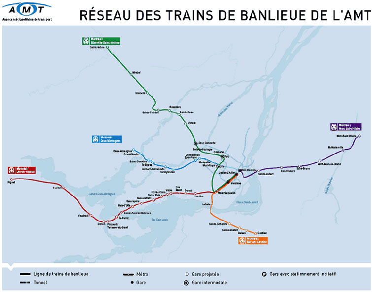 Le réseau de trains de banlieue de l'AMT compte 5 lignes, comprenant 49 gares opérationnelles dont 38 ayant des voies multiples (voir la figure 1). Parmi ces dernières, 28 gares disposent de tunnels ou de passerelles permettant aux usagers d'accéder aux quais sans traverser les voies; les 10 autres comportent des liens inter-quais non munis de moyens pour signaler l'approche des trains ou limiter l'accès aux voies lors de l'arrivée des trains.