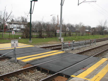 Deux liens inter-quais, situés en bout de quai, permettent aux usagers de passer entre les quais est et ouest de la gare. Ils croisent la voie principale et la voie d'évitement à angle droit. Ils sont considérés comme étant des passages à niveau privés à accès non limité. Ils sont constitués d'éléments en caoutchouc conçus pour des passages à niveau routiers (voir la photo 1). Ils ont une longueur de 22,5 pieds et une largeur de 15 pieds. Il n'y a aucun dispositif de protection automatique pour signaler l'approche d'un train ou empêcher les usagers de traverser les voies lorsqu'il y a un train. Deux panneaux d'avertissement sont fixés à la clôture située entre les voies ferrées pour avertir les usagers d'être vigilants en traversant les voies.