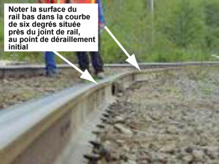 - L'effet combiné du dévers excessif et du pompage des traverses et la présence des joints de rail décalés sur les lieux de l'accident ont contribué à la réduction des charges verticales exercées sur le rail haut de la courbe.
