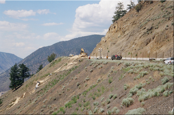 La subdivision Lillooet va de Lillooet, point milliaire 157,6, jusqu'à Williams Lake (Colombie-Britannique), point milliaire 312,9. La région où l'accident est survenu est située en territoire accidenté et montagneux (voir photo 7). Dans le secteur, la voie est construite sur le flanc de la chaîne côtière et longe le cours du fleuve Fraser. Du point milliaire 190,8 aux environs du point milliaire 167,0, la voie descend une pente dont le degré de déclivité varie entre 1,5 % et 2,85 %. La compagnie estime que la pente de contrôle entre Fountain (Colombie-Britannique), point milliaire 165,3, et Kelly ake est de 2,2 % pour les trains qui roulent en direction nord.