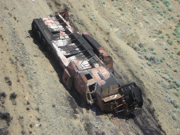 La locomotive continue d'accélérer. Le chef de train et le mécanicien ont tous les deux quitté la cabine et cherchent un endroit où ils pourront sauter du train sans danger, mais la locomotive roule trop vite. Au point milliaire 182,5, pendant qu'elle roule dans une courbe vers la gauche de 12 degrés, la locomotive déraille du côté extérieur de la courbe et glisse sur une distance d'environ 800 pieds vers le bas de la montagne (voir photo 3 et photo 4). Le chef de train, qui prend place sur le marchepied avant droit, est mortellement blessé après avoir été projeté de la locomotive. Quant au mécanicien, qui est en train de passer du côté droit au côté gauche de la locomotive, à l'arrière de celle-ci, il est projeté et subit des blessures graves.