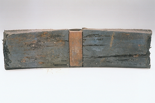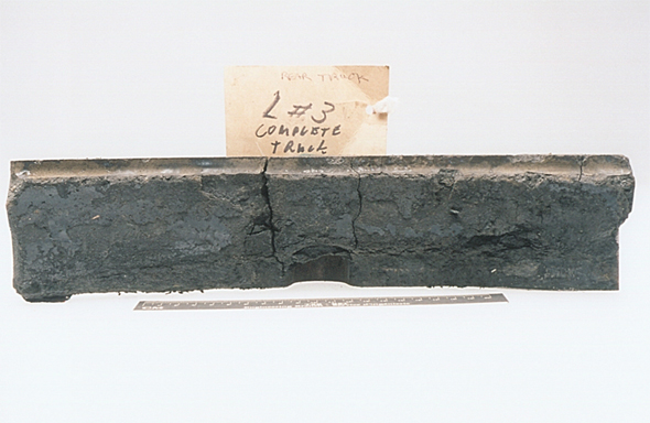 Les semelles de frein de la locomotive montraient les signes caractéristiques de dommages causés par la chaleur. Les garnitures s'étaient délaminées et s'étaient détachées à beaucoup d'endroits, et montraient des surfaces de contact rugueuses et irrégulières. Aux endroits où les garnitures ne s'étaient pas délaminées, les surfaces de contact étaient polies et avaient un aspect brillant. Les semelles de frein étaient minces. L'épaisseur du matériau de friction dans les parties les plus minces de la semelle de frein la plus usée qu'on a retrouvée mesurait environ 3/8 de pouce, en l'occurrence tout juste la limite d'usure acceptableNote de bas de page 8.