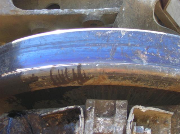 L'examen a révélé que toutes les roues étaient montées sur des essieux, sauf la roue L2Note de bas de page 7, qui s'était séparée net de l'essieu et qu'on a retrouvée à côté de l'essieu. Les tables de roulement des roues montraient des décolorations bleues qui dénotent habituellement une oxydation de surface causée par des températures élevées.