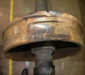 - Le boudin de la roue montrait une zone localisée où le matériau avait été usé par le frottement, ainsi que des marques d'impact localisées.