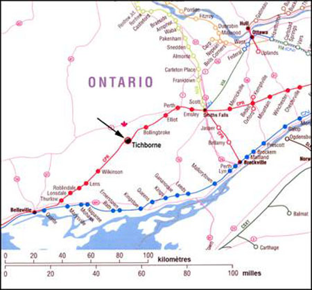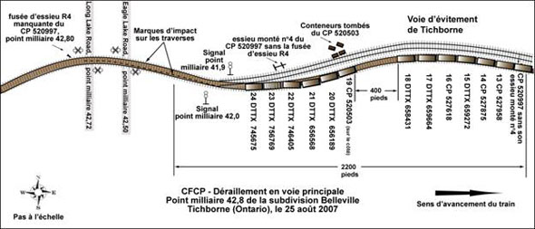 Le 25 août 2007 vers 22 h 30, heure avancée de l'Est tandis que le train de marchandises no 230-25 du Chemin de fer Canadien Pacifique roulait vers l'est à une vitesse d'environ 49 milles à l'heure, un des wagons du train a déraillé au point milliaire 42,80 de la subdivision Belleville, près de Tichborne (Ontario). Le train a poursuivi sa route, franchissant deux passages à niveau publics, jusqu'au point milliaire 42,00. À cet endroit, 12 autres wagons ont déraillé à la hauteur du branchement ouest de la voie d'évitement de Tichborne. La voie ferrée, y compris le branchement et le mât de signaux du point milliaire 41,90, a été endommagée sur une distance de quelque 2 200 pieds. Personne n'a été blessé et il n'y a pas eu de déversement de marchandises dangereuses.