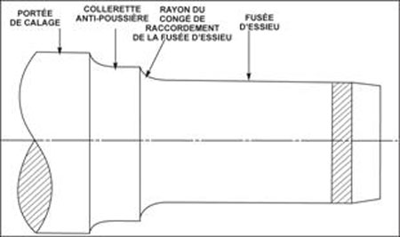 Durant l'assemblage des essieux montés, les roues sont emmanchées à la presse sur les portées de calage, puis les roulements à rouleaux sont emmanchés à la presse sur les fusées d'essieu. La portée de calage et la fusée d'essieu ont des diamètres transversaux différents qui sont reliés entre eux par deux changements de rayon consécutifs, la collerette anti-poussière et le rayon du congé de raccordement de la fusée d'essieu, qui assurent la transition entre le grand diamètre de la portée de calage et le diamètre plus petit de la fusée d'essieu (voir la figure 3). La collerette anti-poussière et le congé de raccordement sont censés avoir tous deux des contours lisses.