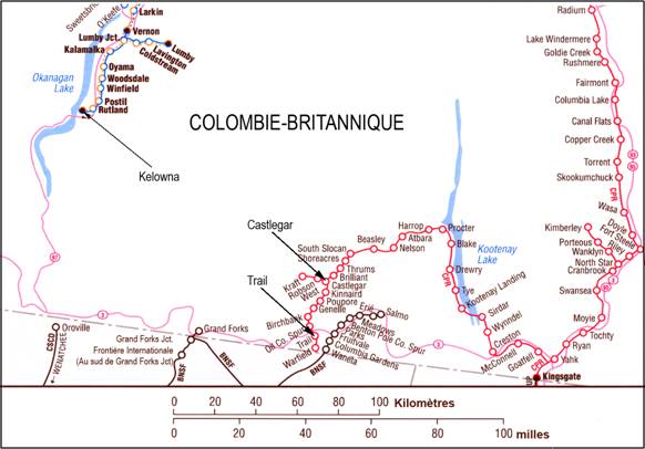 | 14:32:11 | On change de direction et le mouvement s'ébranle en direction du croisement de la West Kootenay Power, point milliaire 21,03 (sommet de la pente). |