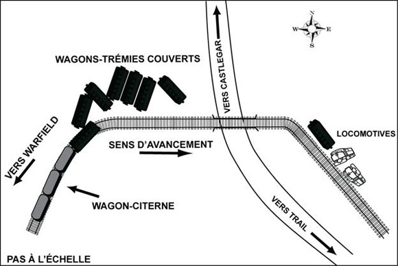 Après avoir terminé les opérations d'aiguillage à Warfield, l'équipe attelle le train aux onze wagons auxquels on doit faire descendre la pente raide menant à Trail : huit wagons-trémies couverts chargés de sulfate d'ammonium en granules et trois wagons-citernes de résidus.