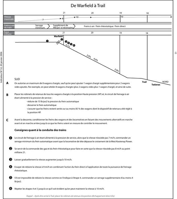 L'indicateur 52 du CFCP, portant sur le secteur du service intérieur (Colombie-Britannique), renferme les instructions d'exploitation spécifiques et les consignes qui s'appliquent à la descente de la côte Warfield (voir la figure 3). Ces consignes, les plus restrictives de l'ensemble du réseau du CFCP, donnent des précisions sur les mesures qu'on doit prendre dans la pente et sur les endroits où il faut les prendre. Les consignes, consistant à utiliser le freinage rhéostatique complété par l'action des freins à air pour régler la vitesse du train, visent à éviter l'évanouissement des freins dû au frottement et à empêcher que le matériel roulant parte à la dérive.