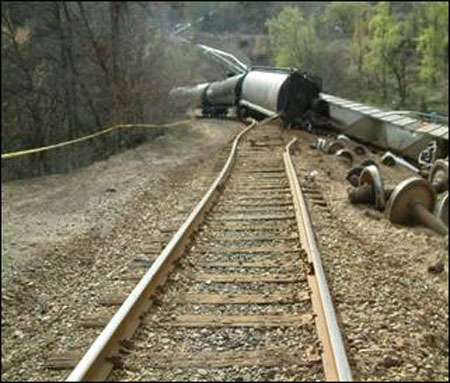 Le train continue de prendre de la vitesse. À une vitesse d'environ 40 mi/h, tandis que le train roule dans une courbe de 16 degrés vers la droite, au point milliaire 19,216, les wagons deux à huit à partir de l'avant du train quittent la voie à l'extérieur de la courbe et se séparent de la partie avant du train. Les trois wagons-citernes de résidus, soit les wagons neuf à onze, restent à la verticale sur les rails.