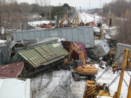 Le 18 février 2008 à 0054:37, heure normale de l'Est, le train de marchandises no M39671-14 est du Canadien National a fait l'objet d'un serrage d'urgence intempestif de ses freins au point milliaire 33,24 de la subdivision Oakville, tandis qu'il traversait Aldershot (Ontario) à une vitesse de 43 milles à l'heure. Vingt wagons ont déraillé, dont cinq wagons-citernes de résidus—trois de ces wagons contenaient des résidus d'acide sulfurique (no ONU 1830) et deux autres contenaient des résidus d'hydroxyde de sodium (no ONU 1824). Le déraillement a causé des dommages considérables à la structure d'un immeuble industriel voisin, mais n'a pas causé de blessures et n'a pas non plus causé de déversement de produits dangereux.