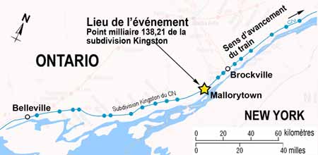 Le 15 juillet 2008, le train no 60 (le train) de VIA Rail Canada Inc. (VIA) roule vers l'est sur la voie principale nord à une vitesse de 83 mi/h. Vers 15 h 15Note de bas de page 1, tandis que le train approche du poteau commandant de siffler situé à un quart de mille à l'ouest du chemin Quabbin, à Mallorytown (Ontario) (voir la figure 1), l'équipe voit un tracteur à semi-remorque transportant de l'équipement lourd qui est immobilisé sur la voie principale nord. Le mécanicien qui est aux commandes voit aussi une personne qui est debout sur la voie entre le camion immobilisé et la locomotive qui approche, et qui agite les bras. Il serre immédiatement les freins et actionne le sifflet de la locomotive. La personne se met alors à courir vers le sud en s'éloignant de la voie ferrée.