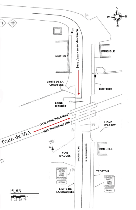 Le train de VIA circulait à une vitesse de 83 mi/h. À cette vitesse, il ne restait pas suffisamment de temps pour arrêter le train lorsque l'équipe a constaté la présence du camion sur le passage à niveau. Pour éviter l'accident, il aurait fallu que l'équipe du train reçoive au moins un préavis d'alerte. En l'absence d'une technologie qui alerterait automatiquement les équipes de la présence d'un objet qui bloque un passage à niveau, l'équipe s'est fiée aux éventuels messages radio d'urgence transmis par les services de contrôle de la circulation ferroviaire. Toutefois, comme les responsables de la compagnie n'avaient pas été avisés du fait que le passage à niveau était obstrué, aucun message radio d'urgence n'a été envoyé.