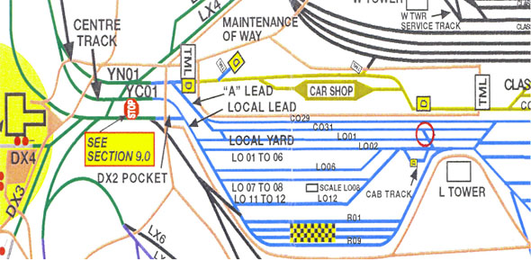 La manœuvre de triage (dont la locomotive asservie suit la locomotive de tête), commandée au moyen de la loco-commande Beltpack, roule en direction ouest sur la voie LO02 à une vitesse d'environ 10 mi/h en approchant du secteur où les opérations de relevage se déroulent, sur la voie LO01. La cloche de la locomotive sonne et le phare avant est réglé sur intensité réduite, tandis que la manœuvre remonte la voie. Le chef de train adjoint de cour de triage prend place du côté sud de la locomotive, et ne peut donc pas observer les opérations de relevage. Le chef de train de cour de triage est en queue de train et contrôle le mouvement.