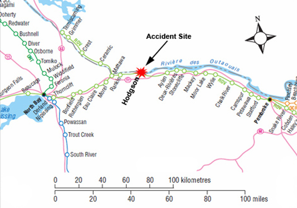 Le 3 juin 2009, vers 3 h, heure avancée de l'Est, alors que le train de marchandises Cobden Turn de l'Ottawa Valley Railway roulait vers l'ouest, deux locomotives et sept wagons ont déraillé au point milliaire 60,1 de la subdivision North Bay, près de Hodgson (Ontario). Les locomotives se sont reversées, ce qui a causé des blessures légères aux membres de l'équipe du train. Environ 17 000 litres de carburant diesel se sont échappés des réservoirs des locomotives, et ce carburant s'est retrouvé en grande partie dans la rivière des Outaouais.