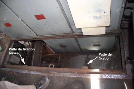 L'inspection de la cabine de la locomotive a révélé qu'un des panneaux du plancher avait été déplacé et s'était détaché. L'ancrage du mécanisme de fixation du panneau s'était brisé (voir la photo 2). La face de rupture de l'ancrage brisé présentait une accumulation de saleté provenant de l'exposition au sous-plancher intérieur et n'avait pas le lustre d'une fracture récente.