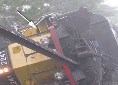 L'inspection des points de sortie de la cabine de locomotive a révélé que le couvercle du logement des batteries était tombé en position ouverte et bloquait l'ouverture de la porte de nez (voir la photo 3). La porte de sortie arrière était enfouie dans la boue. La cabine n'était équipée ni d'une trappe de sortie de secours ni d'un pare-brise de sortie de secours.