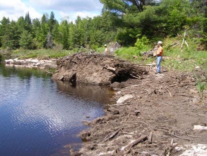 Un ruisseau à proximité s'écoulait par un ponceau posé dans la plate-forme de la voie. Il n'y avait aucun débris dans le ponceau et l'eau s'écoulait librement. Un étang s'était formé en bordure du côté amont de la couche supérieure de la plate-forme de la voie. Des marques laissées par l'eau ont été observés sur le ballast, les traverses et les rails à environ 10 pieds au-dessus du niveau de l'eau observé après l'accident. Il a été déterminé que le haut niveau de l'eau était dû à la rupture catastrophique de trois digues de castor, dont la plus éloignée se trouvait à 1,6 km en amont de la voie; les digues n'étaient pas visibles de l'emprise du chemin de fer de l'OVR. Une partie importante d'une des digues, d'une longueur d'environ 15 pieds, avait été délogée de son emplacement sur du roc lisse (voir la photo 4).