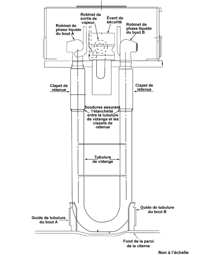 L'assemblage du trou d'homme du wagon comprenait le trou d'homme et le couvercle, deux robinets de phase liquide, un robinet de sortie de vapeur, un évent de sécurité, un puits thermométrique, un dispositif de jaugeage et la tubulure de vidange en forme de U. Les tubulures de vidange s'ajustent dans la partie inférieure des clapets de retenue qui sont soudés à la partie inférieure des robinets de phase liquide. Les tubulures de vidange sont fixées aux gaines des clapets de retenue au moyen de soudures d'angle de 3/16 de pouce (voir la figure 2). Les soudures assurent l'étanchéité mais ne sont pas censées assurer la solidité de la structure. L'assemblage est placé sur le wagon de façon que la tubulure de vidange s'ajuste à l'intérieur de deux guides qui sont soudés à l'intérieur du fond de la paroi de la citerne. Les guides empêchent la tubulure de se déplacer dans le sens longitudinal. L'assemblage au complet est fixé au wagon par des boulons placés sur la partie supérieure de la paroi de la citerne.