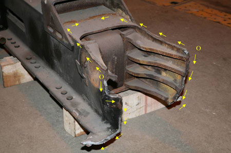 - La rupture de la longrine tronquée résulte d'une succession de fractures dues à des contraintes excessives. La fracture a pris naissance près des extrémités de la nervure de renfort supérieure des deux butées de traction arrière et s'est ensuite propagée des deux côtés. Les côtés avaient fait l'objet de soudures de réparation. La rupture finale s'est produite dans les soudures de réparation temporaires lorsque des efforts de traction normaux ont dépassé la capacité de la section transversale restante de la longrine tronquée.