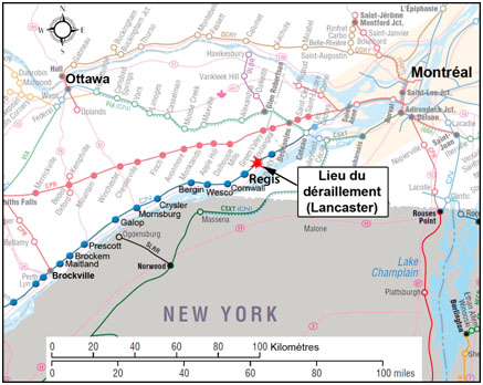 Peu de temps après avoir traversé Regis, en Ontario (point milliaire 65,4), alors que le train roule à environ 46 mi/h sur la voie principale sud, avec les freins desserrés, on réduit les gaz, le manipulateur passant de la position 8 à la position 6. Au point milliaire 57,47, près de Lancaster (Ontario), alors que le train roule à 48 mi/h, un freinage d'urgence intempestif se déclenche. Le train s'immobilise au point milliaire 57,18 (voir la Figure 1).