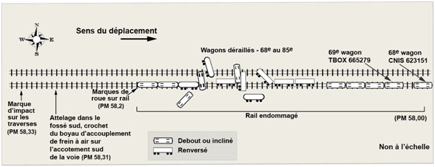 Le wagon CNIS 623151, un wagon plat à poutre centrale qui est vide, s'est immobilisé au point milliaire 57,98, et les roues nord de son bogie arrière avaient déraillé et reposaient sur la joue intérieure du patin du rail. L'avant du wagon suivant, TBOX 665279, un wagon couvert vide, se trouvait à 55 pieds à l'ouest du wagon CNIS 623151. Le wagon s'était immobilisé, et toutes ses roues avaient déraillé. Le rail nord s'était renversé sur la joue extérieure, et les roues reposaient sur la joue intérieure de l'âme. Les roues sud reposaient sur la joue intérieure du rail.
