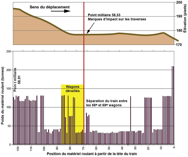 Les dommages modérés subis par l'arrière du 68e wagon et l'avant du 69e wagon démontrent qu'il y a eu un impact relativement faible entre les 2 wagons lorsque la partie arrière de l'un a heurté la partie avant de l'autre. Les dommages au côté nord du 68e wagon et l'angle de repos de l'attelage du 69e wagon, incliné vers le nord, indiquent que la force de l'impact a été appliquée en angle. La force latérale générée était donc suffisante pour causer le renversement du rail et le déraillement du train.