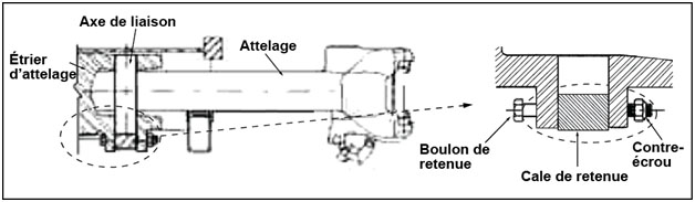 - Le train s'est séparé lorsque le boulon de retenue de l'axe de liaison de l'attelage qui raccordait l'étrier d'attelage à l'attelage de la partie arrière du wagon CNIS 623151 s'est brisé et que l'attelage s'est détaché de l'étrier d'attelage.