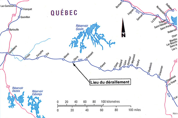 À l'ouest de la zone du déraillement, la voie ferrée décrit une courbe à gauche de 4 ° 45 minutes, dans le sens du mouvement, d'une longueur de 2014 pieds. Du côté est du point de déraillement localisé au point milliaire 165,80, la voie ferrée traverse une zone marécageuse et comporte une section en alignement droit jusqu'au point milliaire 165,63 pour ensuite décrire une courbe à droite de 2 ° 0 minutes, d'une longueur de 773 pieds.