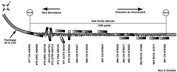 Les 4 premiers wagons déraillés, du 61e wagon au 64e wagon, se sont renversés sur le côté sud de la voie ferrée. Les 2 wagons suivants, les 65e et 66e wagons, sont demeurés sur leurs bogies en position verticale au centre de la plate-forme de la voie ferrée. Les 67e, 68e et 69e wagons se sont renversés sur le côté nord de la voie. Les wagons suivants, du 70e au 75e, se sont empilés à proximité du point de déraillement. Les 2 derniers wagons déraillés sont demeurés en position verticale sur la voie ferrée, le 76e ayant ses 2 bogies déraillés et le 77e ayant uniquement son bogie meneur déraillé.