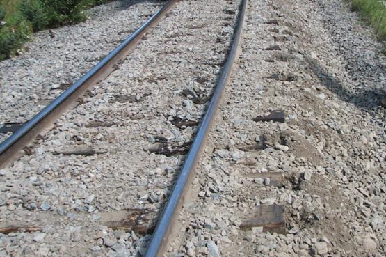 Dans le secteur est de la courbe, à environ 75 pieds derrière le dernier wagon déraillé, la voie ferrée a subi un déplacement latéral d'environ 12 pouces vers l'extérieur de la courbe (côté sud de la voie). Le ballast, constitué principalement de pierres concassées, est en bon état et ne montre pas de signe de colmatage. Le ballast a été perturbé et l'épaulement ne mesure qu'environ 6 pouces de largeur (voir photo 1). De plus, il a été constaté que plus de 50 % des traverses ont été récemment remplacées.