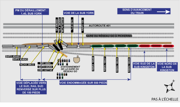 Toutes les locomotives et le premier wagon (wagon-trémie couvert chargé) s'étaient séparés du reste du train CN 376. La locomotive de tête s'est immobilisée à environ 1000 pieds à l'est du passage supérieur du chemin Liverpool Road. Le bogie arrière de la première locomotive isolée (RBRX 18536) et toutes les roues des 3 autres locomotives isolées ainsi que du wagon susmentionné ont déraillé. Il s'est créé une séparation entre le premier wagon et les autres, et les wagons 2 à 11 ont également déraillé. Cinq des wagons se sont retrouvés en portefeuille et obstruaient les 2 voies de la subdivision Kingston. Un wagon à support central en A, chargé de bois d'œuvre, s'est retrouvé dans le stationnement de la gare du Réseau GO à Pickering (figure 2).