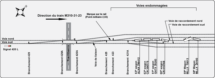 Le 58e wagon, MLLX 26180, premier wagon déraillé, s'est immobilisé sur la voie de raccordement nord, 660 pieds à l'est de la marque observée sur le rail à proximité du branchement 425. Son bogie arrière s'est séparé du wagon et est resté à proximité du branchement 421, soit à environ 425 pieds plus à l'ouest. Le 59e wagon, MLLX 10013, a perdu ses 2 bogies et s'est renversé sur le côté. Ses trappes ont été endommagées, entraînant des fuites de propylène.