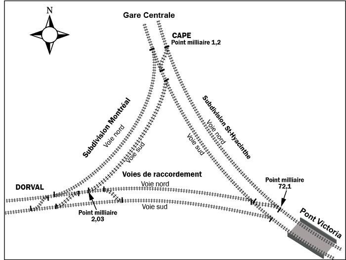 La subdivision Montréal se compose d'une voie principale double qui s'étend de Cape (jonction avec la subdivision St-Hyacinthe) au point milliaire 1,2 près de la gare Centrale de Montréal (Québec) jusqu'à Dorval (Québec) au point milliaire 11,6. Les voies de raccordement nord et sud permettent aux trains de passer de la subdivision Montréal à la subdivision St-Hyacinthe en contournant la jonction de Cape. Elles s'étendent sur une distance de 1,18 mille, à partir du point milliaire 2,03 de la subdivision Montréal jusqu'au point milliaire 72,12 de la subdivision St-Hyacinthe (Figure 3)
