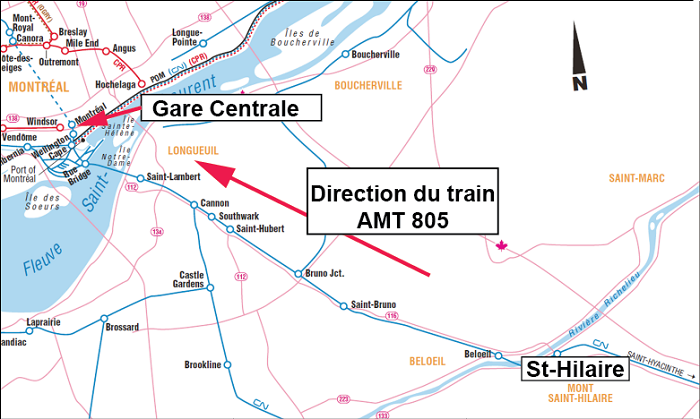 Le 9 décembre 2011, le train 805 (le train) de l'Agence métropolitaine de transport (AMT), train de banlieue régulier, quitte Mont-Saint-Hilaire (Québec) à 7 hNote de bas de page 1 en direction ouest à destination de la gare Centrale, à Montréal (Québec) (). L'équipe se compose d'un mécanicien et d'un chef de train. Tous les 2 répondent aux exigences de leurs postes respectifs, se conforment aux normes de repos et de condition physique et connaissent bien la subdivision.