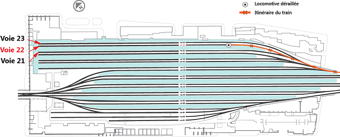 - Le déraillement s'est produit quand une roue de la locomotive AMT 1352, une nouvelle locomotive bimode, est tombée du côté intérieur du rail sud, à la sortie d'une courbe de 11,75 ° de la voie 22, en raison des efforts latéraux élevés exercés par les roues et de l'état des dispositifs de maintien de l'écartement de la voie.